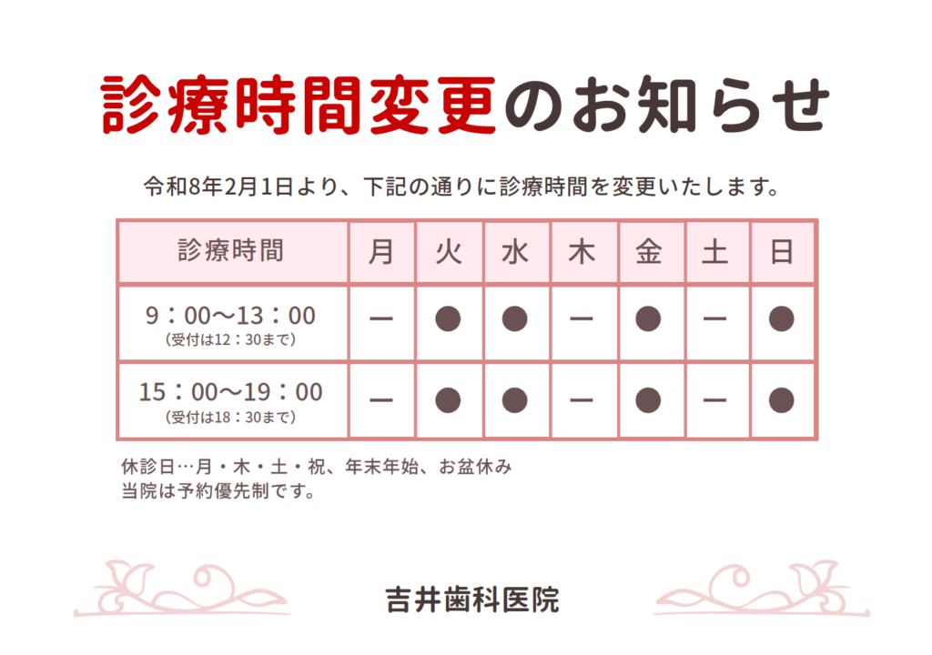 2026/01/20 令和8年2/1〜下記の通り、診療時間を変更させていただきます。 ●診療時間 火・水・金・日 午前診:9:00〜13:00 午後診:15:00〜19:00 ●休診日 月・木・土・祝 よろしくお願いいたします。